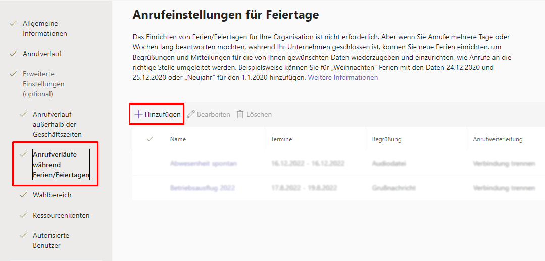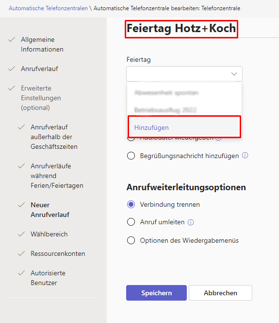 In diesem Fenster kann unter Anrufverläufe während Ferien/Feiertagen ein neuer Eintrag mit dem Knopf Hinzufügen erstellt werden. Oder wenn auf den Namen geklickt wird, kann auch ein bisheriger Eintrag bearbeitet werden.