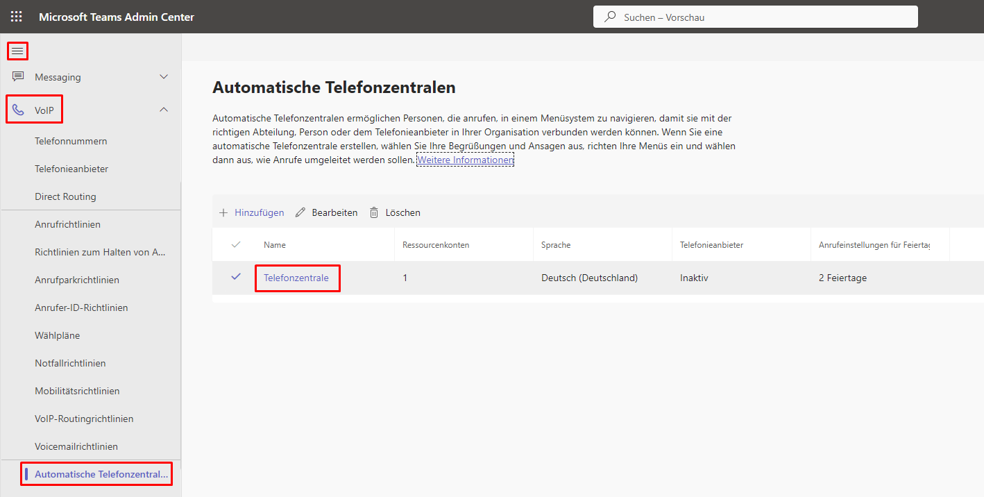 Für das Ändern der Ansage, welche erklingt, wenn man direkt auf der Hauptrufnummer anruft, muss wieder unter VoIP → Automatische Telefonzentralen navigiert werden im Teams Admin Center. Danach kann ebenfalls wieder auf den Namen der automatischen Telefonzentrale geklickt werden
