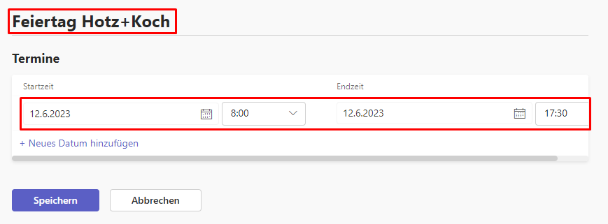 Daraufhin kann dem Termin oben einen Namen gesetzt werden und unter Feiertag im Dropdown Menü auf Hinzufügen geklickt werden.