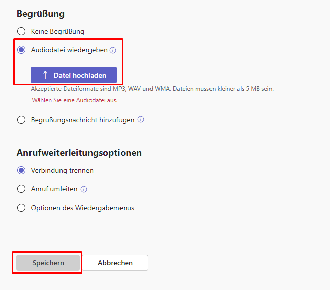 Die Datei muss die Endung MP3, WAV oder WMA besitzen und darf nicht grösser als 5 MB sein.