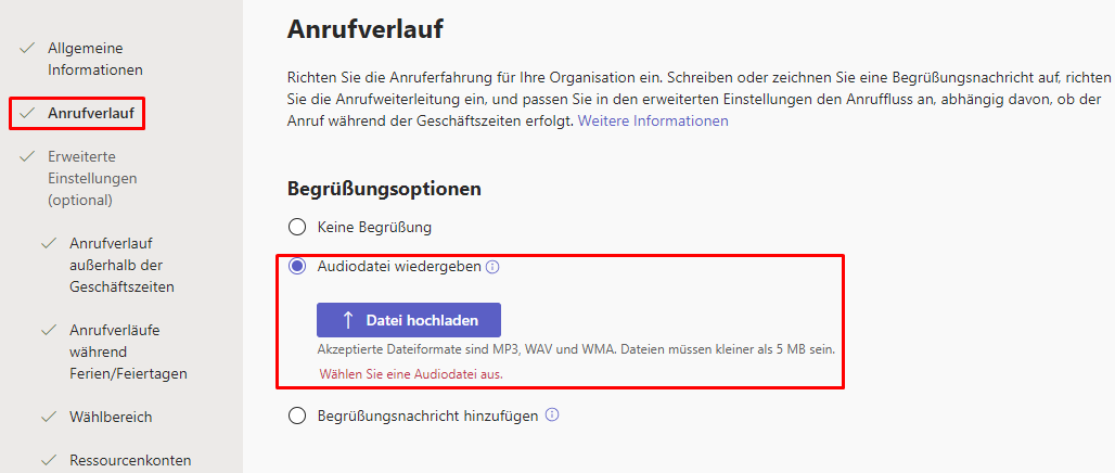 Daraufhin muss zu Anrufverlauf navigiert werden. Dort kann ebenfalls wieder unter Begrüssungsoptionen → Audiodatei wiedergeben eine neue Datei hochgeladen werden.