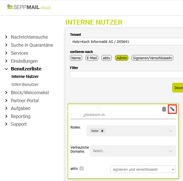Danach den gewünschten Benutzer bearbeiten. Klicken Sie dazu auf das Stiftsymbol.