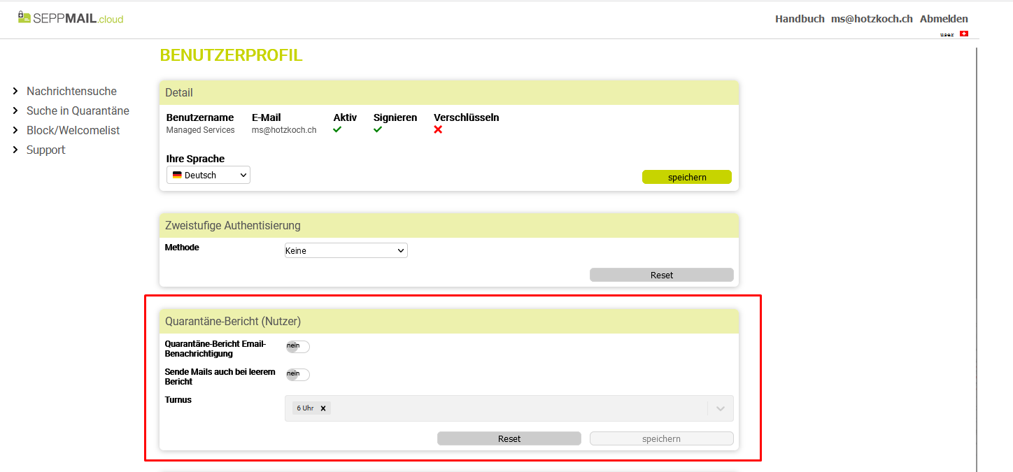 Aktivieren Sie wie folgt den Quarantäne-Bericht im Abschnitt Quarantäne-Bericht (Nutzer)
